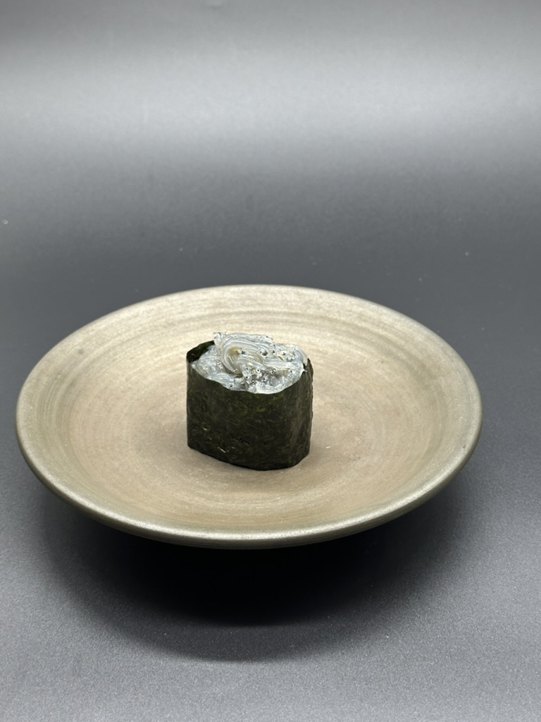 職人が施す手仕事 仕込み生シラスは水分が多く繊細。軽く塩をあてて旨味を凝縮し、海苔の軍艦に盛ることで形と風味を整えます。 隠し味少量の生姜汁をシャリとシラスの間に仕込む。辛味というよりも、苦味と塩味を繋ぐ架け橋として機能し、味わいをひとつ... -